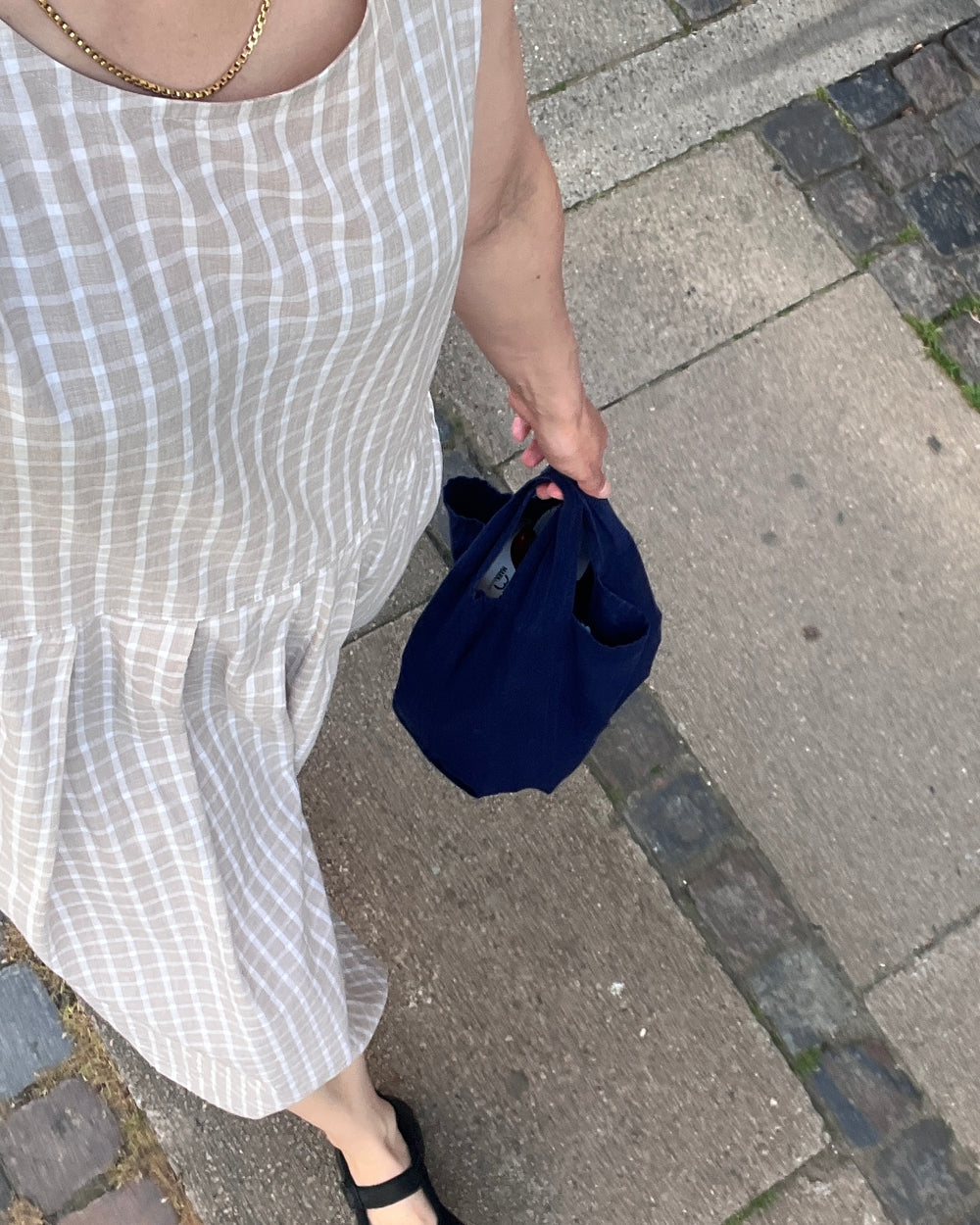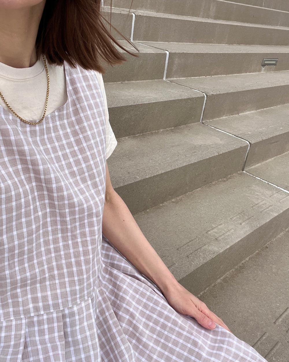 Pleat Dress is a sleeveless maxi dress with a low waistline. The fit is spacious and the dress simply pulls over the head. Armhole and neckline is clean finished with a narrow bias tape facing. The mid length skirt has lots of volume from large knife pleats. The dress features side seam pockets.