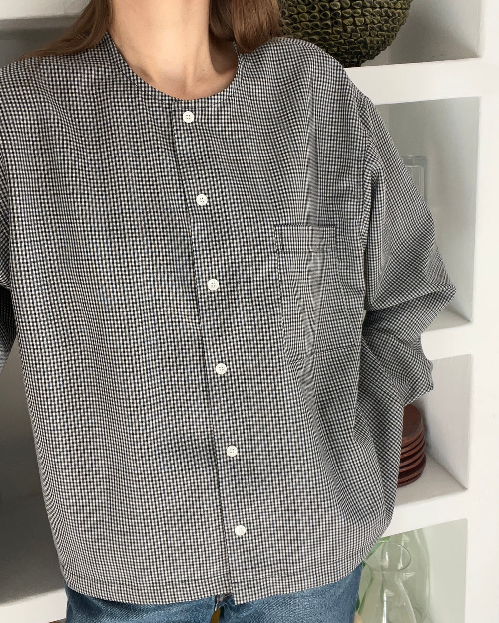 The Simple Shirt is a versatile piece with a few streamlined elements: The button placket is simply folded, the cuff is simplified - no advanced tailoring skills required. When you button the cuff, a graceful pleat naturally forms. The shirt is collarless, with a clean neckline finish using bias tape. Features a curved hem and a square chest pocket on the left side.
